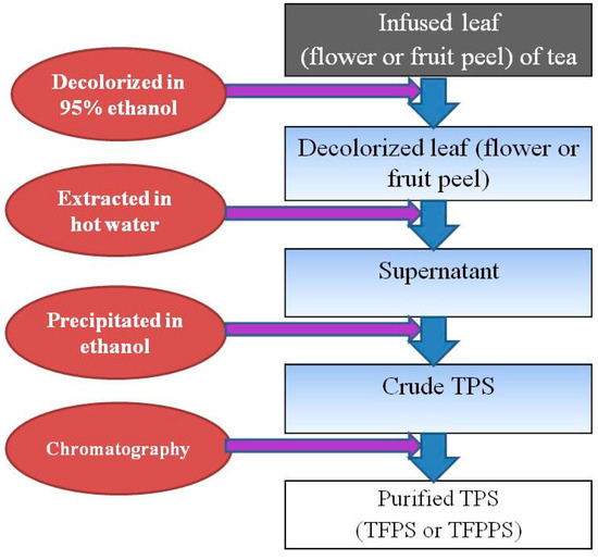 Tea (Camellia sinensis) is a beverage widely drunk across the world [1], and its extracts have been used as medicinal and dietary supplements in many countries such as China, Japan and the US [2]. Tea contains a variety of bioactive compounds including tea polyphenols (TPP) [2], theanine [3] and tea polysaccharides (TPS) [4], which contribute to the health benefits of tea. A polysaccharide is a high molecular weight (MW) polymer, consisting of at least ten monosaccharides mutually joined by glycosidic linkages. The glycosyl moiety of the hemiacetal or hemiketal, together with the hydroxyl group of another sugar unit, formed the glycosidic linkages [5]. TPS is a group of heteropolysaccharides extracted from leaves, flowers and seed peels of the tea plant [4]. Great advances have been made in chemical and bioactive studies of TPP or catechins and related tea products over the last few decades. However, TPS has received rare attention. There have been studies showing that TPS has many health benefits including antioxidant, anti-aging, antitumor, antibacterial and anti-skin-aging properties, as well as the ability to inhibit diabetes, improve immunity, and alleviate hepatotoxicity [6,7,8]. The preparation, chemical composition and physiological activities of TPS are reviewed in the present paper.