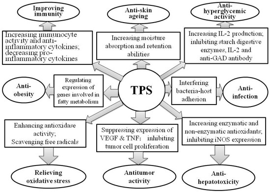 TPS has many bioactive activities, including relieving oxidative stress by enhancing endogenous antioxidant enzymes or directly scavenging free radicals; antitumor activity by suppressing the expression of VEGF and TNF and inhibiting tumor cell proliferation; anti-hyperglycemic activity by increasing IL-2 production and inhibiting starch digestive enzymes, IL-2 and anti-GAD antibody; improving immune activity by enhancing immunocyte activity, increasing the level of anti-inflammatory cytokines such as IgA, IgG, IgM, IL-2, IL-4, IL-10 but decreasing pro-inflammatory cytokines such as TNF-α AND IL-6; anti-hepatotoxicity by increasing enzymatic and non-enzymatic antioxidants and inhibiting iNOS expression via reducing TLR4 signaling; anti-skin-aging by increasing moisture absorption and retention abilities; and anti-infection of bacteria by interfering bacteria-host adhesion. Furthermore, TPS plays a role in weight control by downregulating the genes related to fatty metabolism, such as gene Lpin2 in the pathway of triacylglycerol biosynthesis [88] (Figure 2).