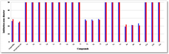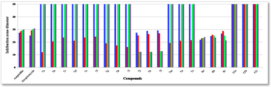 | Ampicillin | - | - | 27.4 ± 0.1 | 28.6 ± 0.5 | 29.4 ± 0.7 | 29.9 ± 0.3 | 26.3 ± 0.3 | 28.5 ± 0.1 | - | - | - |