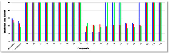 | Clotrimazole | - | - | - | - | - | - | - | - | 26.1 ± 0.1 | 23.1 ± 0.3 | 18.3 ± 0.1 |