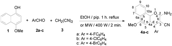 - El-Agrody, A.M.; Al-Dies, A.M.; Fouda, A.M. Microwave assisted synthesis of 2-amino-6-methoxy-4H-benzo[h]chromene derivatives. Eur. J. Chem. 2014, 5, 133–137. [Google Scholar] [CrossRef]