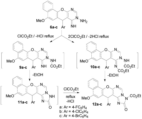 - El-Agrody, A.M.; Sabry, N.M.; Motlaq, S.S. Synthesis of some new 2-substituted 12H-chromeno[3,2-e][1,2,4]triazolo[1,5-c]pyrimidine, 3-ethoxycarbonyl-12H-chromeno[3,2-e]-[3,2-e][1,2,4]triazolo[1,5-c]pyrimidine-2-one, ethyl 2-formylamino/acetylamino-4H-chromene-3-carboxylate and some of their ntimicrobial activities. J. Chem. Res. 2011, 35, 77–83. [Google Scholar]