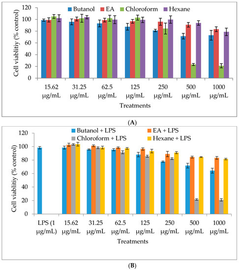 Effect of different solvent fractions (butanol (BUT), ethyl acetate (EA), chloroform (CHO), and hexane (HEX)) of M. oleifera extract on cell viability of RAW264.7 macrophages. The macrophages were treated with various concentrations of the fractions without lipopolysaccharide (LPS) (A) and with LPS (B) incubated for 24 h. After the incubation period, cell viability was determined by MTT (3-(4,5-dimethylthiazol-2-yl)-2,5-diphenyltetrazolium bromide) assay. Values are expressed as the percentage viability of the control cells. All experiments were conducted in triplicate and results are expressed as mean ± SD.