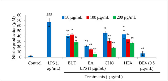 Effect of different solvent fractions (butanol, ethyl acetate, chloroform, and hexane) of M. oleifera extract on nitric oxide (NO) production in LPS-stimulated macrophages. Macrophages were treated with LPS in the absence or presence of the fractions at various concentrations (50, 100, and 200 µg/mL) for 24 h. After the incubation period, cell culture supernatants were harvested and NO production was determined by Griess reagent. Values are expressed as described in the Methods section. All experiments were conducted in triplicate and results are expressed as mean ± SD. ### p < 0.001 vs. control; ** p < 0.01 and * p < 0.05 vs. LPS treatment.