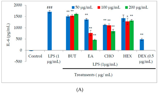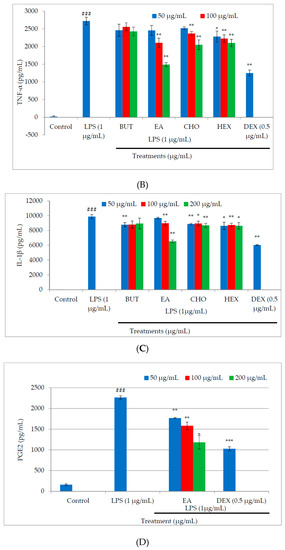 Effect of different solvent fractions (butanol, ethyl acetate, chloroform, and hexane) of M. oleifera extract on interleukin (IL)-6 (A), tumor necrosis factor (TNF)-α (B), IL-1β (C), and prostaglandin E2 (PGE2) (D) production in LPS-stimulated macrophages. Macrophages were treated with LPS in the absence or presence of the fractions at various concentrations (50, 100, and 200 µg/mL) for 24 h. After the incubation period, cell culture supernatants were harvested, and IL-6, TNF-α, IL-1β, and PGE2 production was determined by ELISA. Values are expressed as described in the methods section. All experiments were conducted in triplicate and results are expressed as mean ± SD. ### p < 0.001 vs. control; *** p < 0.001, ** p < 0.01, and * p < 0.05 vs. LPS treatment.
