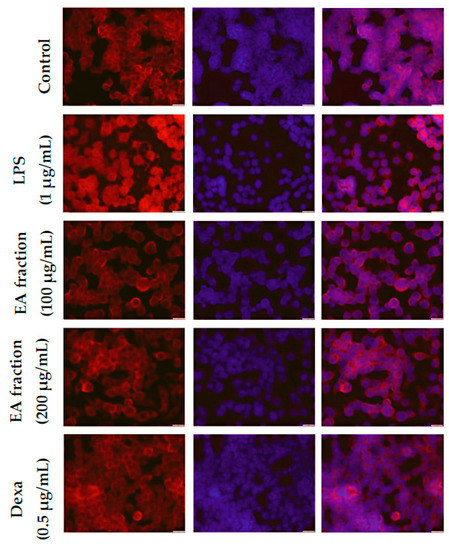 The effect of the ethyl acetate fraction on NF-κB nuclear translocation in LPS-stimulated macrophages was observed using immunofluorescence staining (Figure 5). The images show that translocation of NF-κB p65 was significantly induced by LPS exposure. Treatment with ethyl acetate fraction strongly attenuated NF-κB expression and its dependent inflammatory response, similar to the results obtained from immunoblot analyses. These results concluded that the anti-inflammatory action of the ethyl acetate fraction was mediated via the NF-κB-dependent signaling pathway.