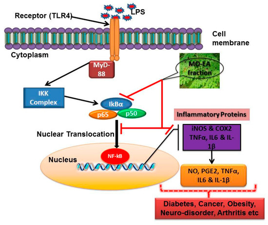 Schematic illustration of the possible inhibitory mechanism of ethyl acetate fraction of M. oleifera in suppressing LPS-activated inflammatory pathway.