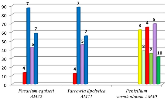 Since the aim of the present study was to obtain and characterize the structures of the biotransformation productsf—hydroxylactone 7 and also hydroxy-halolactones 8–10—preparative scale biotransformations were performed in the next step. The best strains selected during the screening biotransformation were used for this purpose. The results of this are shown in Figure 2.