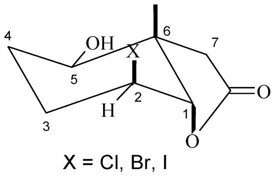 Analysis of 1H-NMR spectra of the hydroxyhalolactones 8–10 proved that the halolactone ring structure was retained. Such a conclusion was evidenced by the narrow doublet coming from proton H-1 (J = 3.2 Hz for 8, J = 3.5 Hz for 9, and J = 4.0 Hz for 10) and the wide multiplet coming from proton H-2, indicating their equatorial and axial position, respectively. Also the wide doublet of doublets (J = 10.7 Hz for 8, J = 10.3 Hz for 9, and J = 9.1 Hz for 10) coming from the hydroxy group at carbon C-5 suggested its axial orientation and an equatorial position of the hydroxy group (Figure 4).