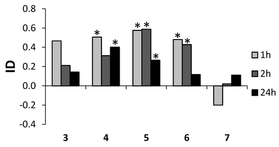 Effect of lactones 3–7 on settling preferences of Myzus persicaein the choice test. ID—index of deterrence, * p < 0.05 (according to statistical analysis using Student t-test) (STATISTICA (data analysis software system), version 10, 2014, StatSoft, Inc., Tulsa, OK, USA, www.statsoft.com).