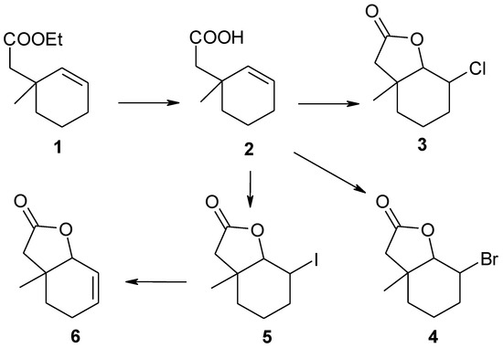 Unsaturated ester 1 was hydrolyzed into the known [25] γ,δ-unsaturated acid 2 according to the known method [26]. This acid was then converted into the new chloro-3, bromo-4, and known [25] iodolactone 5 according to the procedure described earlier [27]. Iodolactone 5 was then used to obtain unsaturated lactone 6. Here we present the synthesis and spectral data of compounds 3–6, more Data can be found in the Supplementary Materials. This data will be useful in studying the relationship between the structures of the substrates and their interaction with microorganisms.