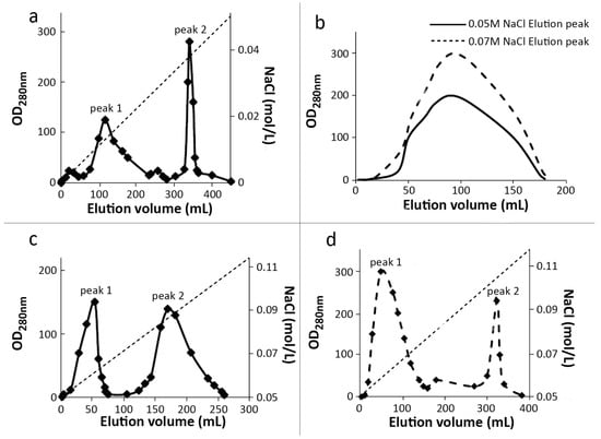 Elution profile of mono-PEGylated RIPs on Macro-Cap SP and SP-Sepharose FF column. (a) Chromatography of α-MMC and mono-PEGylated α-MMC fractions on Macro-Cap SP column. Peak 1 was 10 kDa-mono-PEGylated α-MMC and peak 2 was unmodified α-MMC; (b) chromatography of α-MMC and mono-PEGylated α-MMC fractions on SP-Sepharose FF column. 0.05 M NaCl elution peak was 10 kDa-mono-PEGylated α-MMC and 0.07 M NaCl elution peak was unmodified α-MMC; and (c,d) were the chromatography profiles of MAP30 and mono-PEGylated MAP30 fractions on the Macro-Cap SP and the SP-Sepharose FF column. Peak 1 were 10 kDa mono-PEGylated MAP30 and peak 2 were unmodified MAP30. The unconjugated mPEG-SC was washed away in the first step when adding samples to the Macro-Cap SP column or the SP-Sepharose FF column.