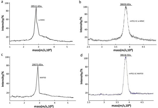 MALDI-TOF/TOF analysis of RIPs and 10 kDa mPEG-SC-RIPs. (a,c): MALDI-TOF/TOF profile of α-MMC and MAP30. The average molecular weights were 28,551.6 Da and 29,073.0 Da; (b,d): MALDI-TOF/TOF profile of 10 kDa mPEG-SC-α-MMC/MAP30. The average molecular weights were 38,650.6 Da and 38,618.5 Da.