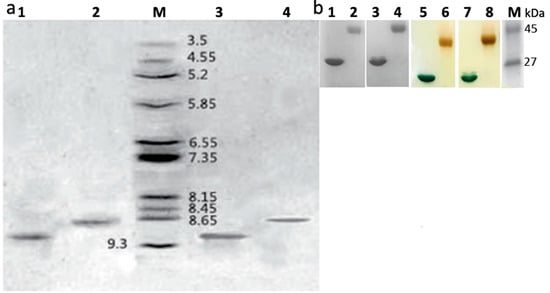 - Laemmli, U.K. Cleavage of structural proteins during the assembly of the head of bacteriophage T4. Nature 1971, 227, 680–685. [Google Scholar] [CrossRef]
