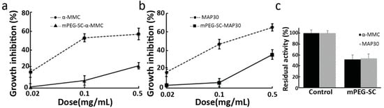 In order to further analyze the change of molecular weight after modification, MALDI-TOF/TOF was used in this part. The accurate molecular weight was shown in Figure 3 which displayed that the molecular weights of unmodified α-MMC and MAP30 were 28,551.6 Da and 29,073.0 Da, respectively. Compared with unmodified α-MMC and MAP30, the mPEGylated counterparts were 38,650.6 Da and 38,618.5 Da, respectively. It can be indicated that the 10 kDa mPEG-SC was successfully conjugated with our purified RIPs to a certain extent.