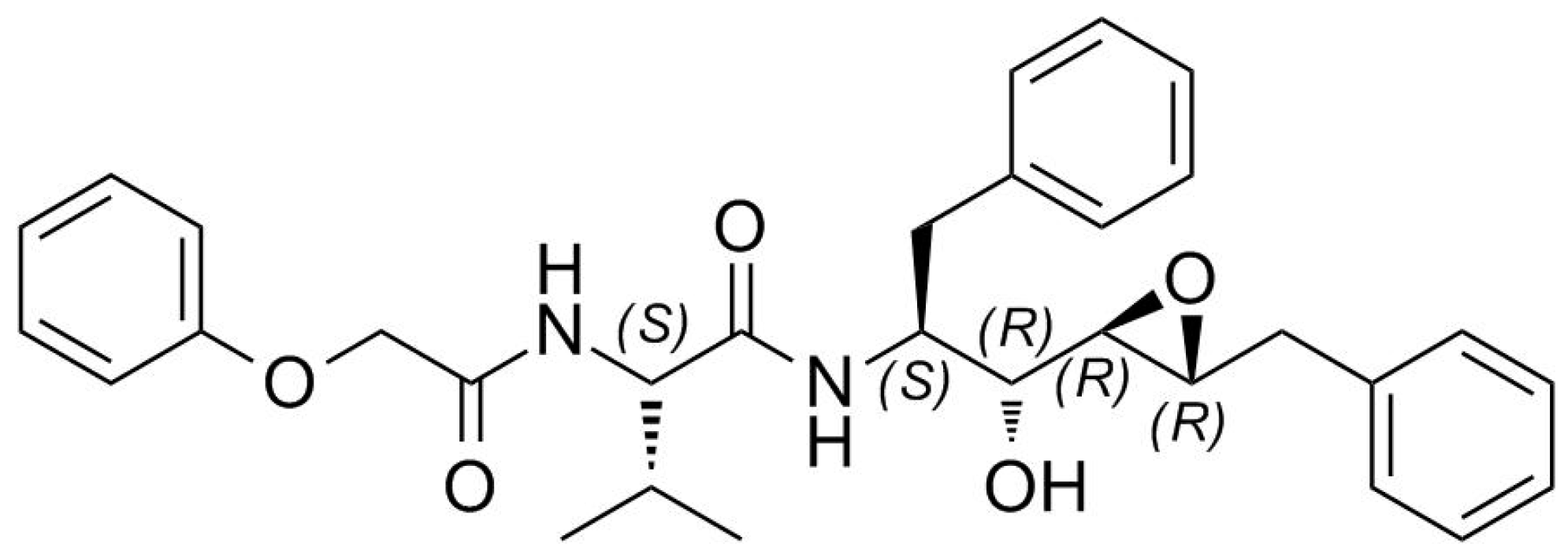 It is widely acknowledged that structural information on protein targets complexed with inhibitors helps guide improved synthesis of lead compounds [20,21,22,23,24]. However, the direct use of protein crystals in making new ligands for a particular protein target by in-situ synthesis is just emerging [25]. Recently, we reported how the configuration of the epoxide carbons plays a crucial role in determining the binding affinity of an inhibitor [16]. PR was complexed with a new potent inhibitor containing an epoxy moiety within a Phe-Phe pseudodipeptide fragment (Figure 1).