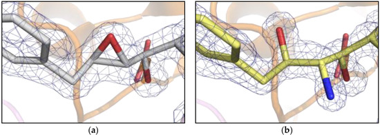 - Emsley, P.; Cowtan, K. Coot: Model-building tools for molecular graphics. Acta Crystallogr. Sect. D Biol. Crystallogr. 2004, 60, 2126–2132. [Google Scholar] [CrossRef] [PubMed]