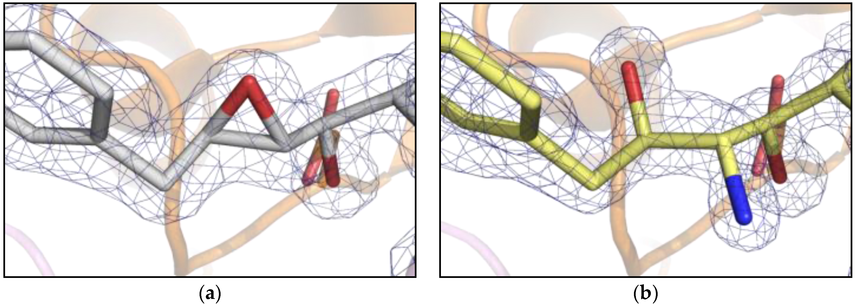 - Murshudov, G.N.; Vagin, A.A.; Dodson, E.J. Refinement of macromolecular structures by the maximum-likelihood method. Acta Crystallogr. Sect. D Biol. Crystallogr. 1997, 53, 240–255. [Google Scholar] [CrossRef] [PubMed]