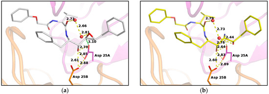 Previous crystallographic studies on PR/EPX complex evidenced that the β-carboxylate group of the catalytic aspartate residue 25B is involved in hydrogen bonding with the hydroxyl group of the inhibitor, contributing to successfully stabilizing the inhibitor in the active site (Figure 3a) [16]. This carboxyl group is rather far from the epoxide carbon atoms. Conversely, the carboxyl group of the other aspartic acid 25A is in very close contact with one of the carbons of the oxirane ring. The distance between the two atoms is only 3.10 Å and the carboxylate oxygen atom is well aligned with the epoxide ring forming an angle of 95° with the carbon–carbon bond of the ring (Figure 3a). This value is close to the optimal trajectory calculated for the epoxide opening by Asp25 nucleophiles in HIV protease models by Mavri, who suggested that the deprotonated aspartate should attack the oxirane upon proton transfer to the leaving oxygen by the other protonated aspartic residue [26]. This proton transfer is clearly not possible in our case, as the epoxide oxygen is oriented upwards and far from the aspartic side chains. However, a water molecule was found at hydrogen-bond distance from the oxygen and could provide protons to assist the epoxide opening. This evidence suggested that the reaction did not occur at pH 6.0, as described by the reported crystal structure [16], because Asp25A was not available as a nucleophile in the catalytic site, since it was protonated.