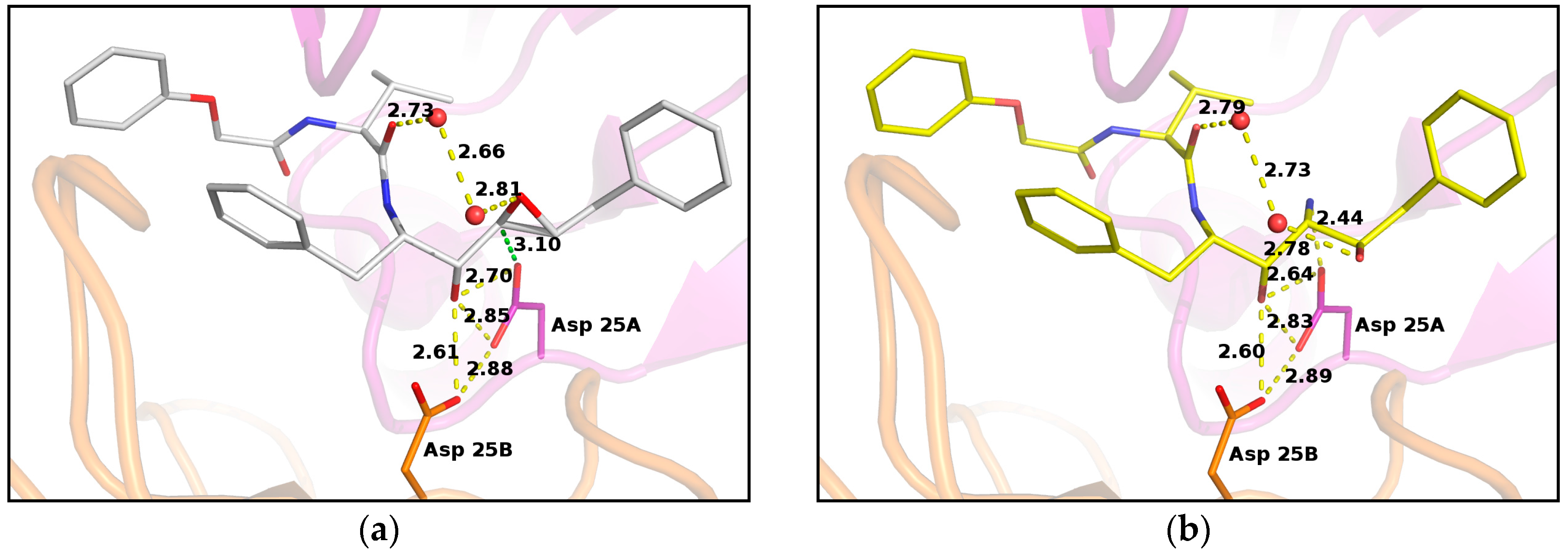 - Das, A.; Mahale, S.; Prashar, V.; Bihani, S.; Ferrer, J.L.; Hosur, M.V. X-ray snapshot of HIV-1 protease in action: Observation of tetrahedral intermediate and short ionic hydrogen bond SIHB with catalytic aspartate. J. Am. Chem. Soc. 2010, 132, 6366–6373. [Google Scholar] [CrossRef] [PubMed]