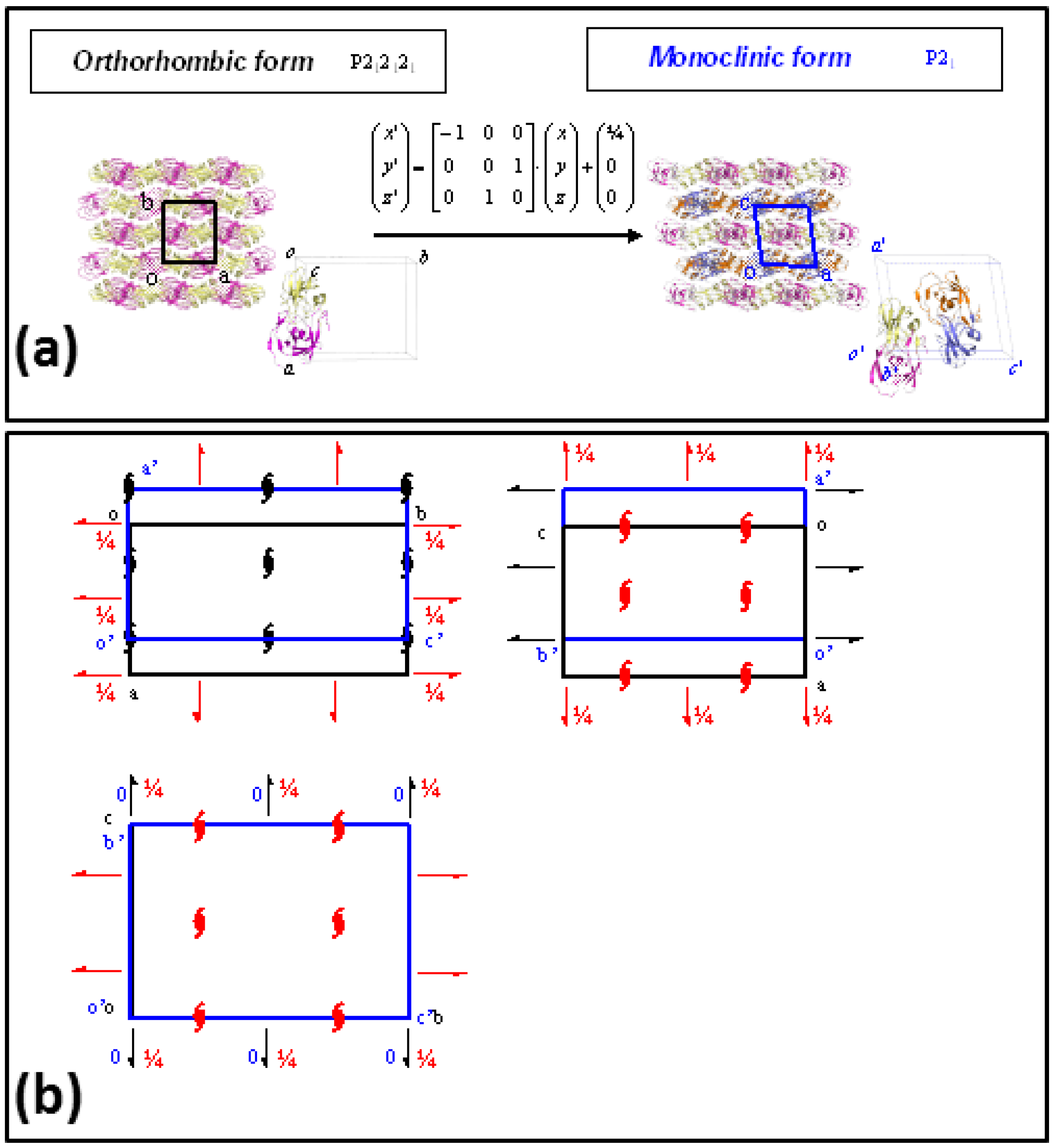 Group/subgroup relations in PR/EPX crystal forms. (a) Transformation of the asymmetric orthorhombic form (space group P212121) in that of monoclinic form (space group P21). The transformation matrix and the translation vector of the atomic coordinates are also reported; (b) Superposition of the P212121 space-group diagram of the orthorhombic form (black) with the space-group diagram of the maximal non-isomorphic sub-groups P21 of the monoclinic form (blue) shows the origin shift (1/4, 0, 0), the axes swapping (−a, c, b) and the missing symmetry operators (red symbols) to transform the lattice of orthorhombic form to that of monoclinic form.