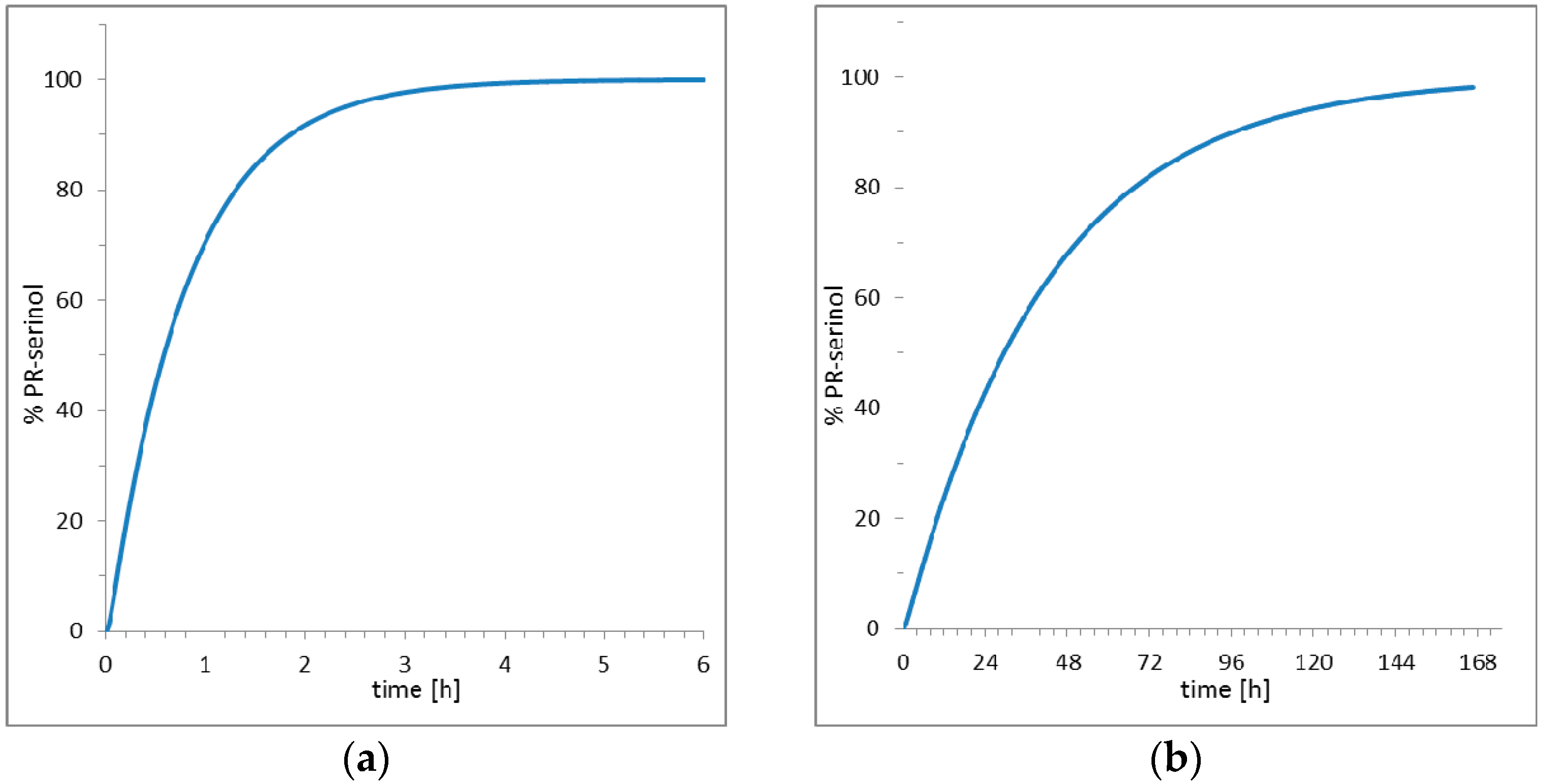 The striking result obtained in this study is that the pH increase did not promote deprotonation of the catalytic aspartate with formation of irreversible covalent bond inhibitor. Rather, the nucleophilic ammonia molecule, produced by increasing the pH, diffused into the crystal and directly attacked the inhibitor and opened the epoxide ring. The opening of the epoxide ring led to the formation of a new inhibitor with two additional functional groups, hydroxyl and amine. Then, the nucleophilic attack of ammonia on oxirane ring of the inhibitor produced an amino diol derivative with common designation, serinol because it is a structural analogue to the amino acid serine [28]. The high-resolutions X-ray data collected after crystal perturbation suggests that the inhibitor reacted while bound to the active site of the enzyme, since an exchange with a preformed amino diol derivative with release of the epoxide inhibitor would require a large rearrangement of the protein domains [29,30] and a decrease in the order of the crystal. Such a hypothesis is also supported by simulation studies of the entire kinetic process which includes diffusion of small molecules into protein crystals, binding and release of inhibitors, and reaction with ammonia in or out of the crystal (Table S2). Two scenarios are presented in Figure 5 elaborated using COPASI [31] (a software application for simulation and analysis of biochemical networks and their dynamics) and the algorithm for simulation of diffusion processes in protein crystals earlier described [27]. With the hypothesis of reaction inside the crystal (Figure 5a), about 3 h are theoretically required to saturate the active site with amino diol derivative. On the contrary, the hypothesis which shows that the amino diol derivative is generated exclusively in the mother solution with the excess of the inhibitor and then it diffuses and replaces the EPX inhibitor in the protein crystal is presented in Figure 5b. The simulation (Figure 5b) shows a much slower process, with a very long duration, about one week, required to saturate the enzyme with the new inhibitor.