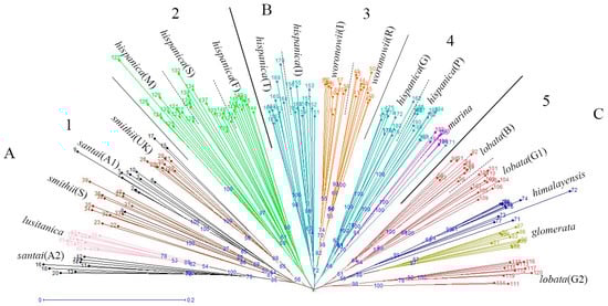 Neighbor-jioning dendrogram of 196 individuals of 20 accessions (nine D. glomerata subspecies), created with Darwin V5.0148. A, B and C mean the 20 accessions could be divided into three groups, and the number 1−5 indicate five clusters in accordance with the STRUCTURE analysis results when K = 5.