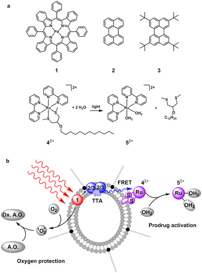 - Askes, S.H.C.; Bahreman, A.; Bonnet, S. Activation of a Photodissociative Ruthenium Complex by Triplet–Triplet Annihilation Upconversion in Liposomes. Angew. Chem. Int. Ed. 2014, 53, 1029–1033. [Google Scholar] [CrossRef] [PubMed]