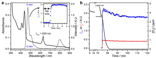 Emission spectroscopy in air of L12 liposomes in PBS supplemented with l-Asc or GSH. (a) Absorption (solid) and emission spectra (dotted: t = 0; dashed: t = 5 min) of L12 liposomes in PBS supplemented with 5 mM l-Asc. Inset shows the upconversion intensity (IUC at 474 nm) for the first 5 min of irradiation with 3 s intervals; (b) Time trace of the upconversion intensity (IUC at 474 nm, blue), phosphorescence intensity (Ip at 800 nm, red), and dissolved oxygen concentration (black) during red light irradiation of L12 liposomes in PBS supplemented with 5 mM l-Asc. The laser was turned on after 74 min in the dark, as indicated by the arrow. Exp. conditions: [DLPC] = 1 mM, [1] = 0.5 µM, [2] = 5 µM, 2.25 mL sample, T = 20 °C, 10 mW 630 nm laser excitation (80 mW/cm2) with approximately 8% of the volume simultaneously irradiated, pH 7.0–7.6.