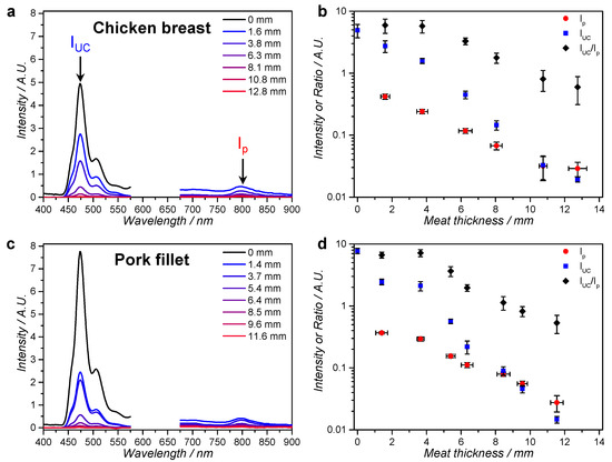 Emission spectroscopy of an upconverting liposome gel through layers of chicken breast or pork fillet. Emission spectra of gellified L12 liposomes through layers of meat at room temperature as a function of: chicken breast thickness (a); or pork fillet thickness (c). Upconversion intensity (IUC, at 474 nm), phosphorescence intensity of compound 1 (Ip) and the ratio of IUC and Ip as a function of: chicken breast thickness (b) or pork fillet thickness (d). Conditions: 20 µL sample in a 25 µm × 25 mm diameter disk of L12 liposomes ([DLPC] = 10 mM) in 0.5% wt % agarose gel, 5 mM l-Asc, and 5 mM GSH in PBS at room temperature, irradiated with 30 mW (3 mm spot, 0.57 W/cm2) 630 nm light through a variable number of meat slices. The spectra are cut off between 575 nm and 675 nm to omit the large excitation scatter peak.