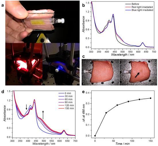 Irradiation of L134 liposomes through a thick slice of pork fillet. (a) Photographs of the experimental setup used for red and blue light irradiation. The 2 mm cuvette holding 400 µL L134 ([DLPC] = 10 mM) is covered with 7 mm pork fillet and irradiated for 2 h from above with a collimated 110 mW 630 or 450 nm beam (3 mm spot size, 1.6 W/cm2 intensity, 11.2 kJ/cm2 light dose); (b) UV-vis absorbance spectra of the sample before (black) and after irradiation with 450 nm (blue) or 630 nm light (red); (c) Photographs of the pork fillet after red (left) or blue light irradiation (right). Upon blue light irradiation, a clear “burn mark” was observed, as indicated with the arrow. UV-vis absorbance spectra (d); and the absorbance difference at 490 nm (e) as a function of irradiation time for L134 liposomes irradiated through 7 mm pork fillet with 300 mW 630 nm light (4.2 W/cm2). Experiment performed once. Arrows indicate the evolution of the spectrum in time near the indicated wavelengths.