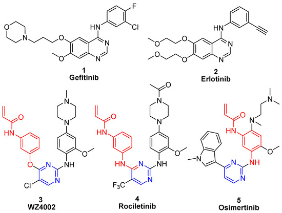 Non-small cell lung cancer (NSCLC) accounts for approximately 85% of all lung cancers [1]. Genetic aberrations within the tyrosine kinase domain of the epidermal growth factor receptor (EGFR) have been identified as key drivers of NSCLC progression [2]. Inhibition of the EGFR kinase domain and resulting oncogenic cell signaling disruption via small molecule inhibitors, such as gefitinib (1) and erlotinib (2) (Figure 1) has been shown to be particularly beneficial for patients carrying the so-called “sensitizing mutations”, such as L858R or the exon-19 deletion [3,4,5]. Although such EGFR inhibitor drugs exhibit high response rates, clinical experiments demonstrated that approximately 60% of patients would eventually suffer from drug resistance after a treatment period, due to a conversion of the “gatekeeper” threonine 790 to methionine (T790M) [6,7,8].