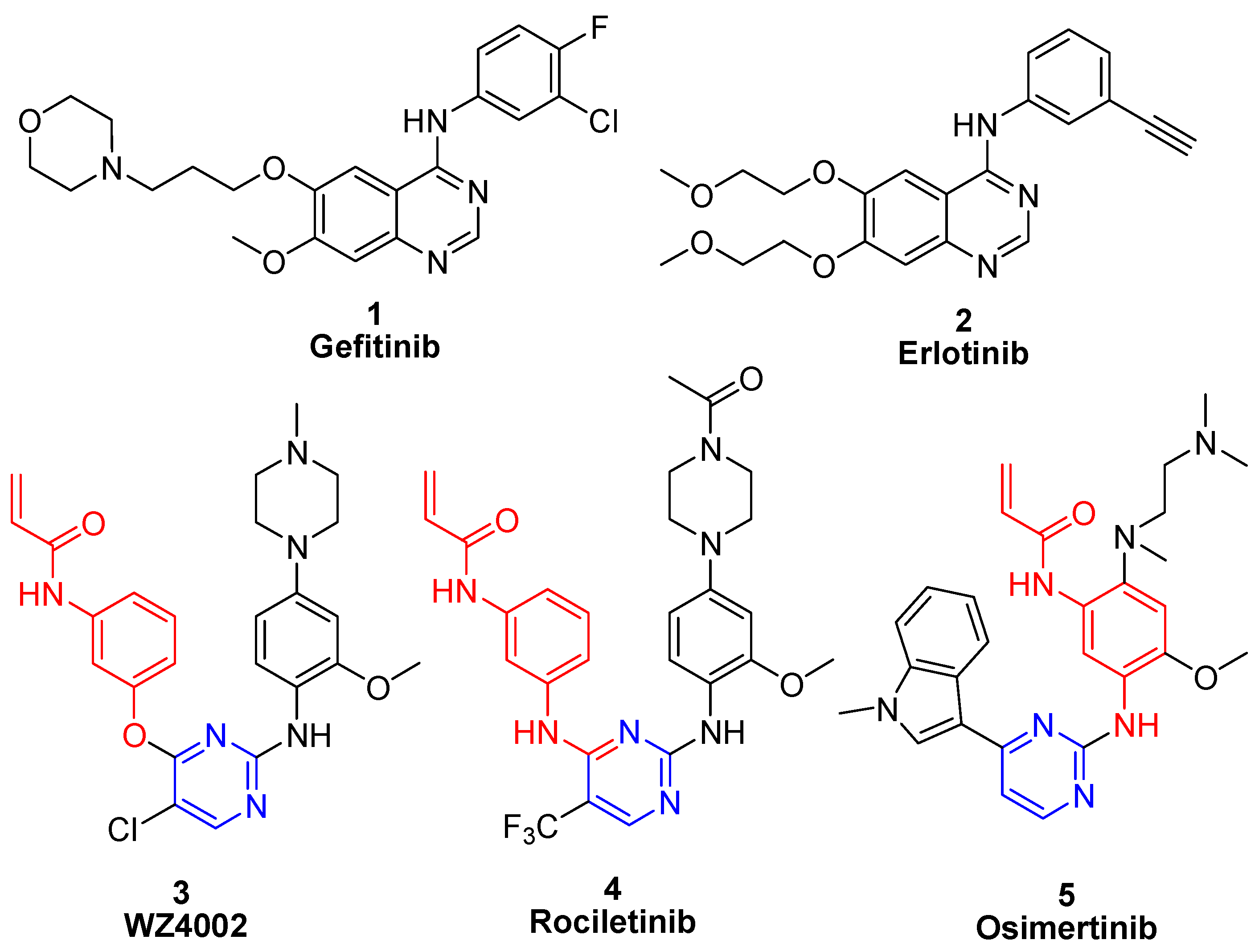 - Walter, A.O.; Sjin, R.T.; Haringsma, H.J.; Ohashi, K.; Sun, J.; Lee, K.; Dubrovskiy, A.; Labenski, M.; Zhu, Z.; Wag, Z.; et al. Discovery of a mutant-selective covalent inhibitor of EGFR that overcomes T790M-mediated resistance in NSCLC. Cancer Discov. 2013, 3, 1404–1415. [Google Scholar] [CrossRef] [PubMed]