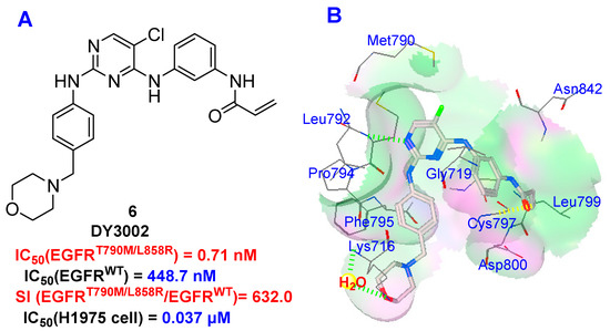 Recently, irreversible EGFR inhibitors have been developed that contain a Michael acceptor functional group and that circumvent the T790M mutation-related resistance. These inhibitors form a covalent bond with Cys797 within the EGFR active site and have revealed preclinical activity against T790M-containing mutants of EGFR [9]. However, wild-type EGFR and EGFR T790M mutant share highly similar three-dimensional structures and virtually identical binding affinities with ATP. Consequently, almost all of the reported, irreversible EGFR inhibitors displayed equal potencies against T790M mutant and wild-type enzyme, highlighting the current challenge in the search for EGFRT790M mutant-selective inhibitors [10,11]. WZ4002 (3) [12], rociletinib (4) [13], and osimertinib (5) [14,15] are typical EGFR T790M inhibitors and a phase trial has revealed capability in gefitinib-resistant NSCLC patients who suffer from EGFR mutations (Figure 1). Unfortunately, only osimertinib possesses exceptional biological properties, and has thus been approved in 2015 for the treatment of patients with metastatic EGFR T790M mutation-positive NSCLC [16]. On the basis of considerable efforts to identify more effective and safe agents to overcome gefitinib-produced resistances [17,18,19], we found the novel diphenylpyrimidine derivative N-(3-((5-chloro-2-(4-((1-morpholino)methyl)phenylamino)-4-pyrimidinyl)amino)phenyl)acrylamide (6, DY3002, Figure 2) [20]. The molecule displayed enhanced activity and increased selectivity against EGFRT790M and was thus reported as a promising NSCLC clinical candidate.