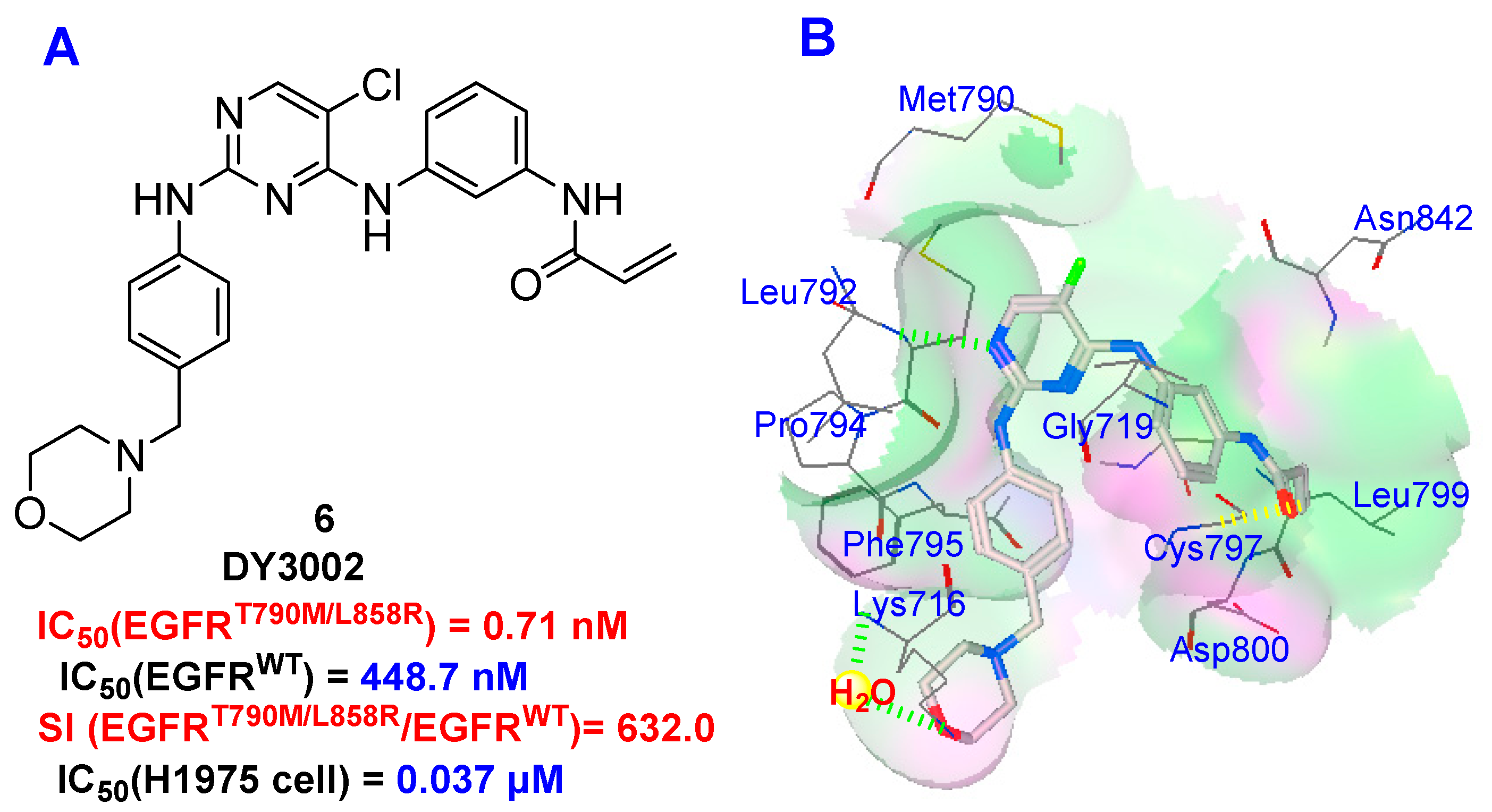 Structure of DY3002 (A) and its putative binding mode with EGFRT790M enzyme (B).