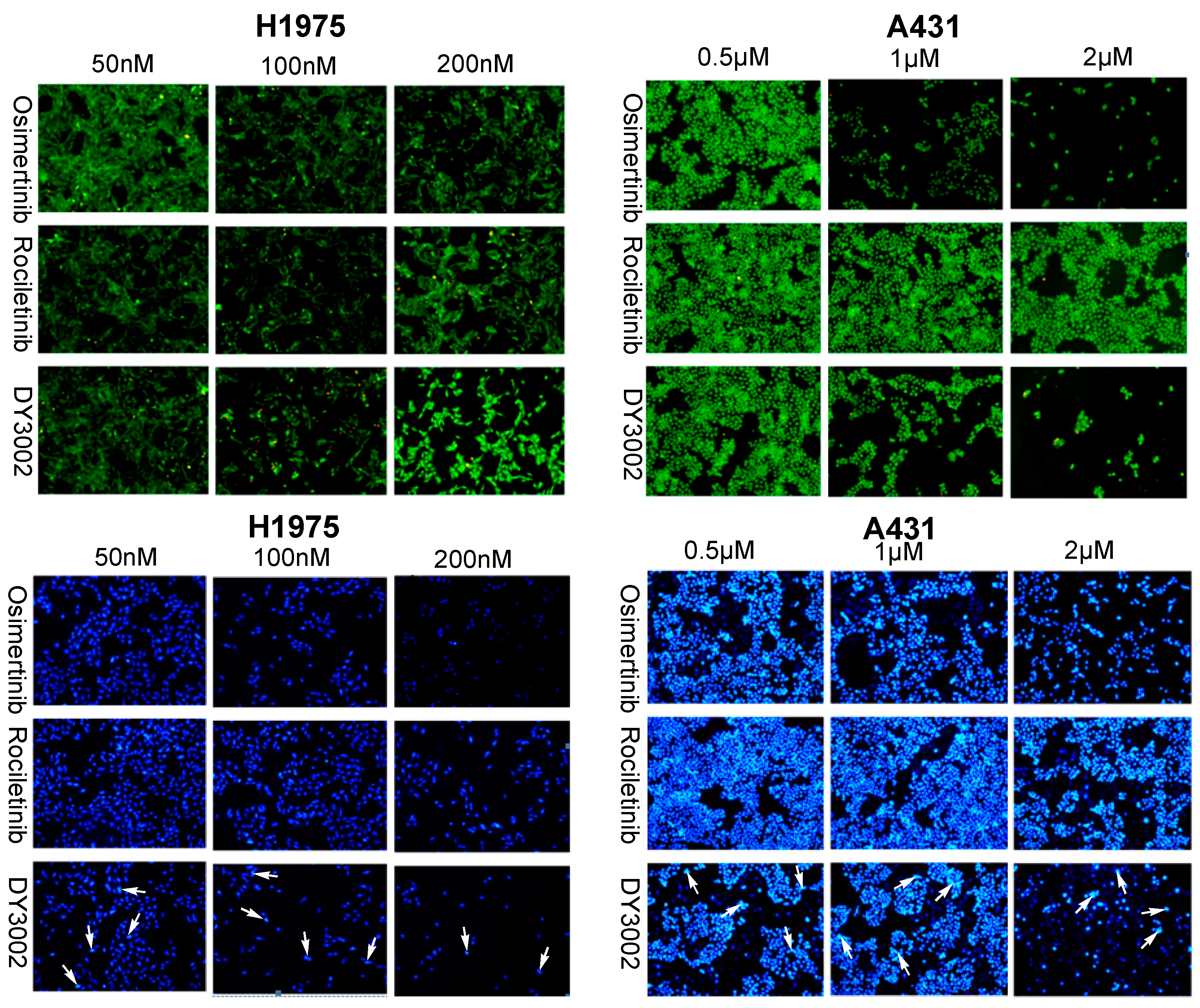Morphological changes of H1975 and A431 cells (100×, final magnification, green images: AO/EB double fluorescent staining of H1975 and A431 cells treated with different concentrations of osimertinib, rociletinib, and DY3002 for 48 h, blue images: DAPI staining of H1975 and A431 cells treated with different concentrations of osimertinib, rociletinib, and DY3002 for 48 h). White arrows represented typical apoptotic cancer cells.