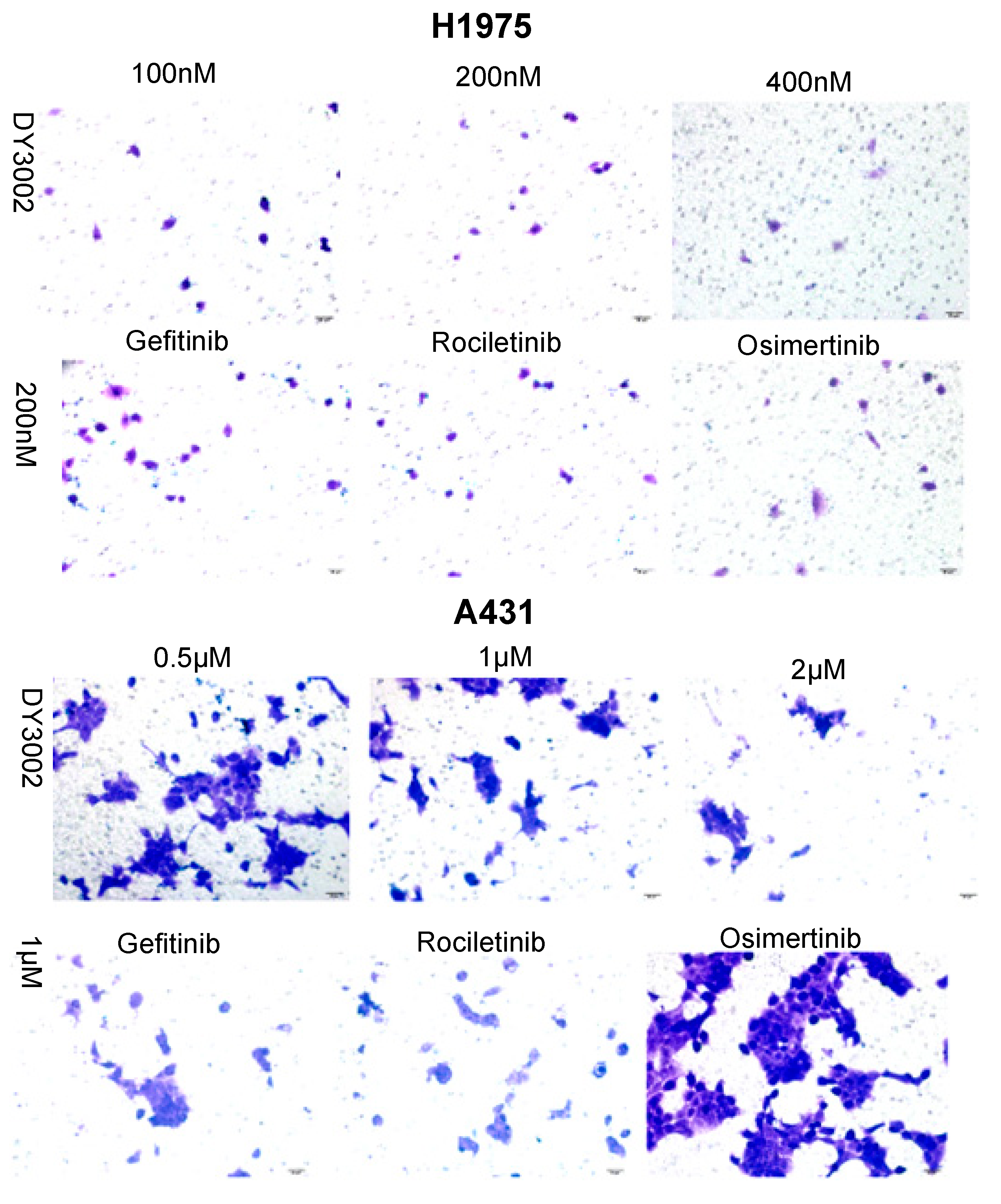 Representative images of H1975 and A431 cells treated with DY3002, rociletinib, and osimertinib by the transwell invasion assay.