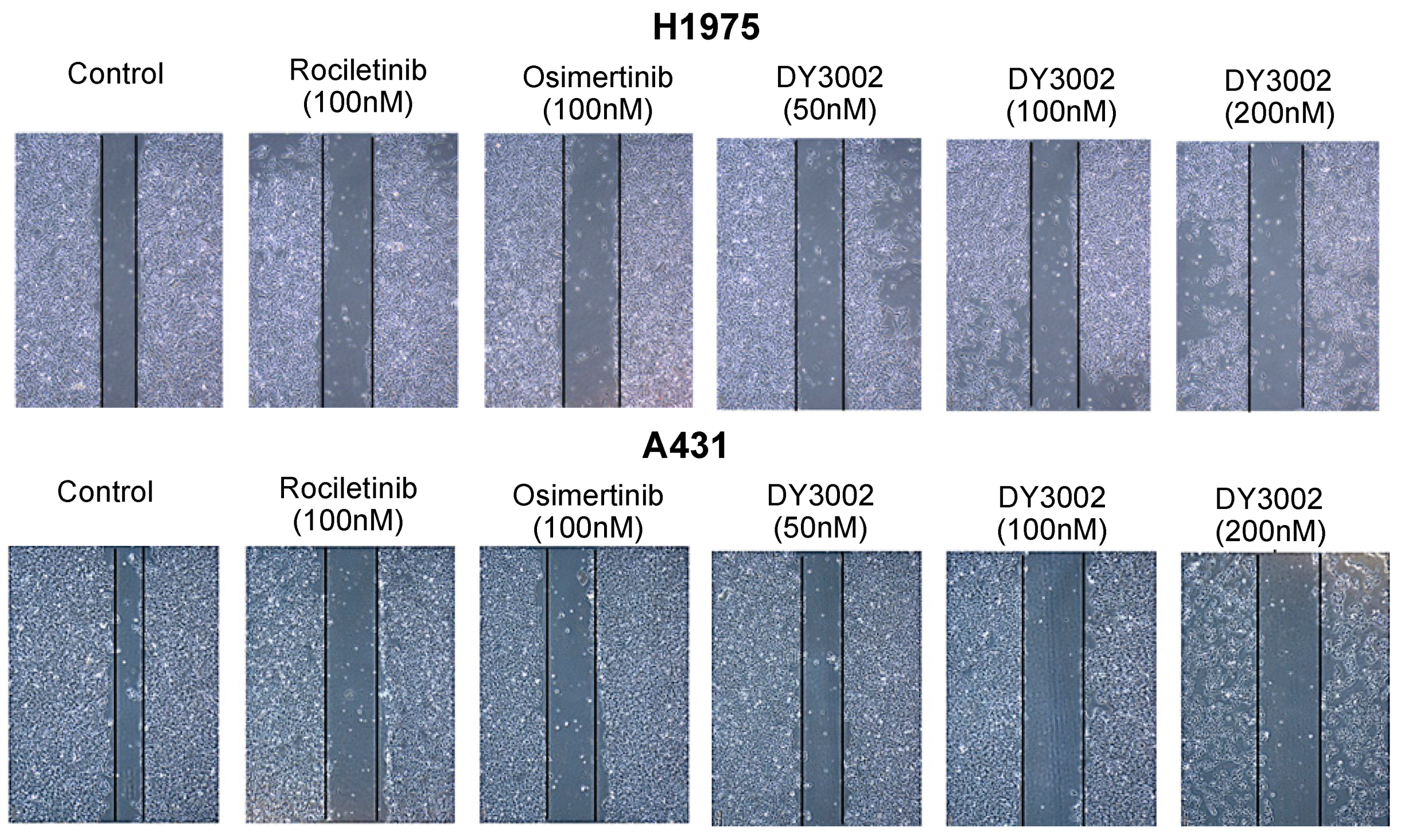 Representative images of H1975 and A431 cells treated with different concentrations of DY3002, rociletinib, and osimertinib for 48 h by the wound-healing assay.