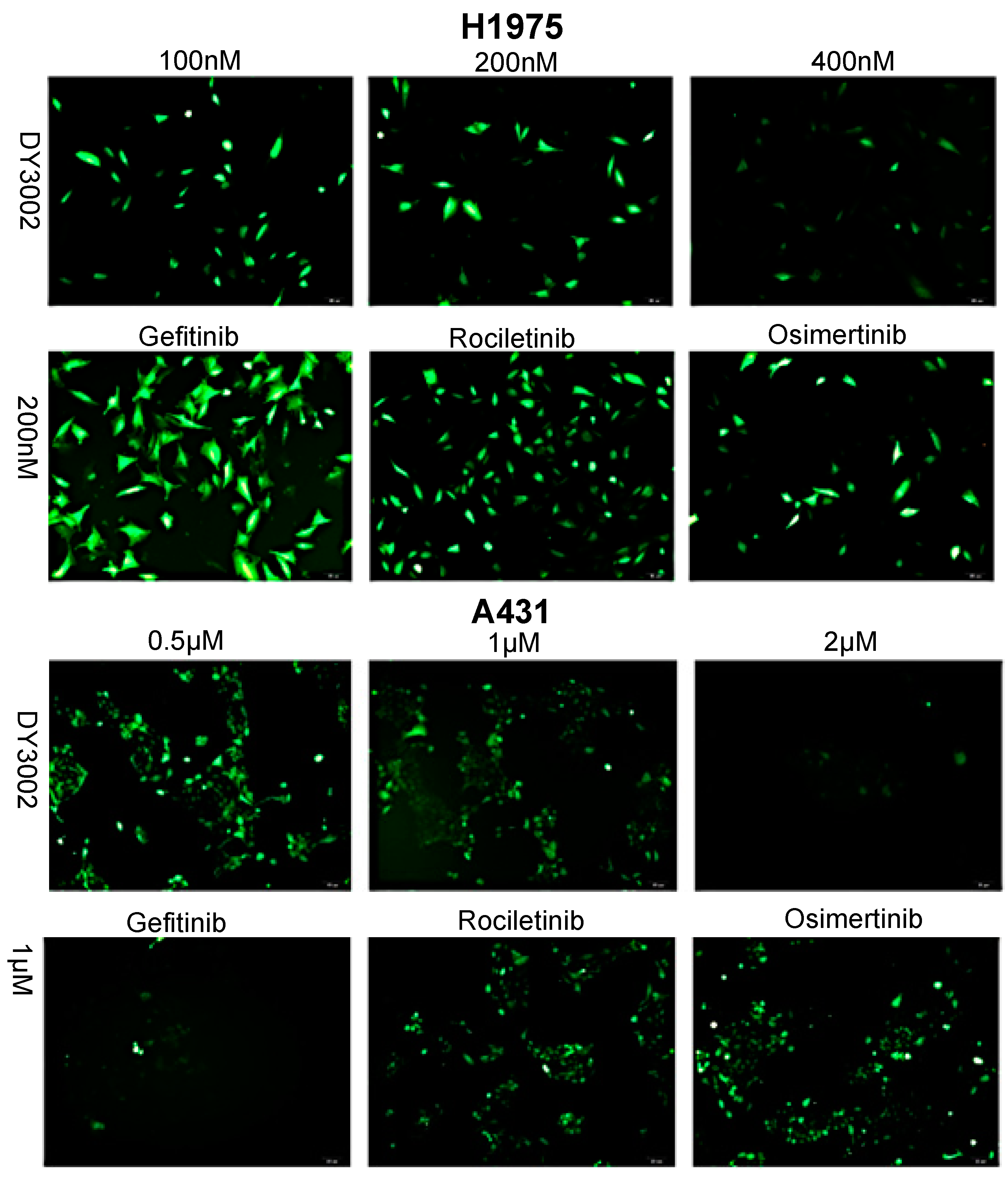 Representative images of H1975 and A431 cells treated with DY3002, rociletinib, and osimertinib by the ROS detection. Cells were treated with different concentrations of inhibitors for 24 h, then the cells were harvested, resuspended in 1 mL of DCFH-DA (10 mM), and detected the levels of ROS.