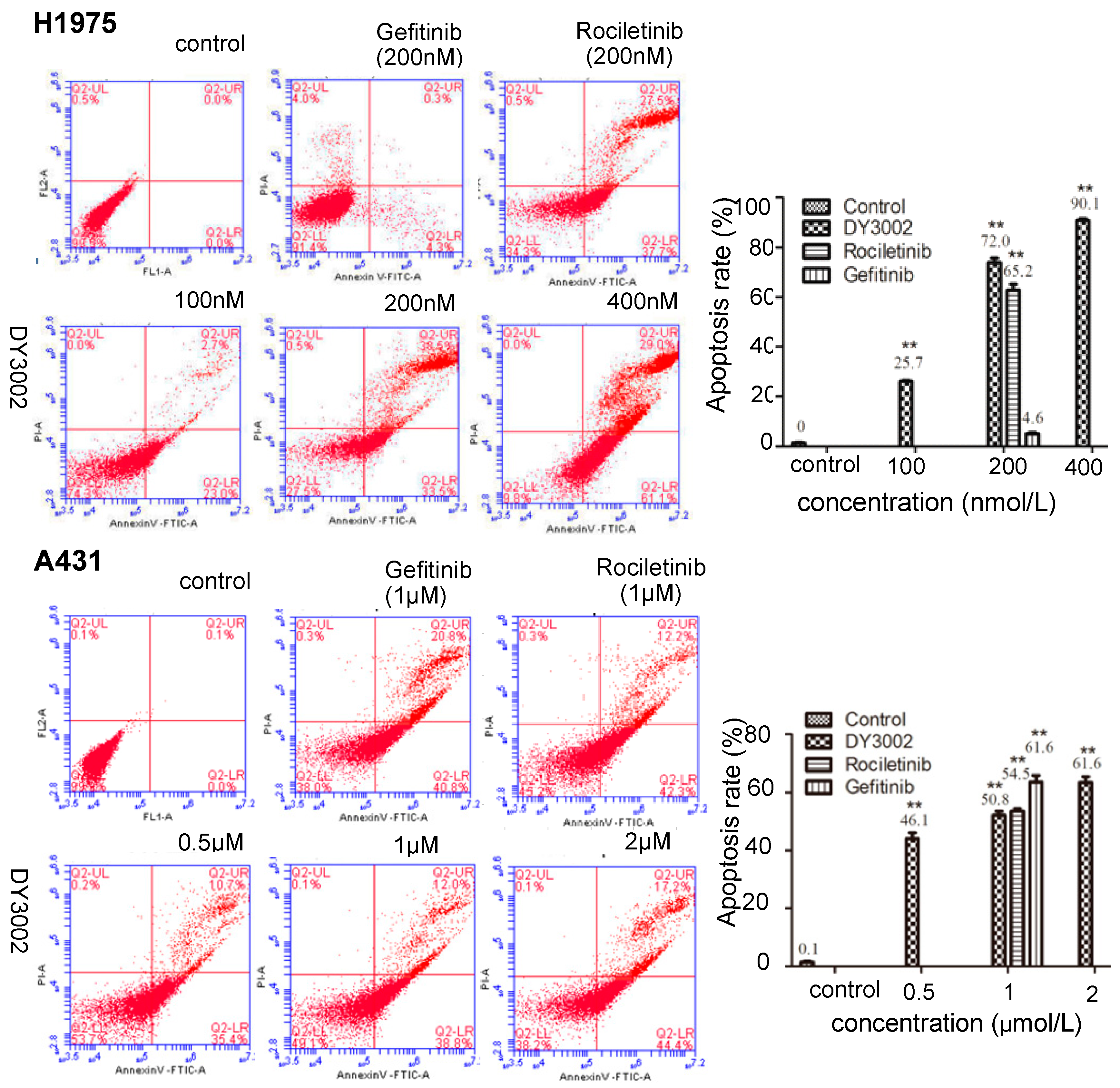 Effects of DY3002, rociletinib, and gefitinib on A431 and H1975 cells cycle arrest detected by flow cytometry assay. Cells were treated by different concentrations of inhibitors for 48 h, then were stained with Annexin V-FITC/propidium iodide and analyzed by flow cytometry assay. Results are representative of three separate experiments, dates are expressed as the mean ± standard deviation, ** p < 0.01.