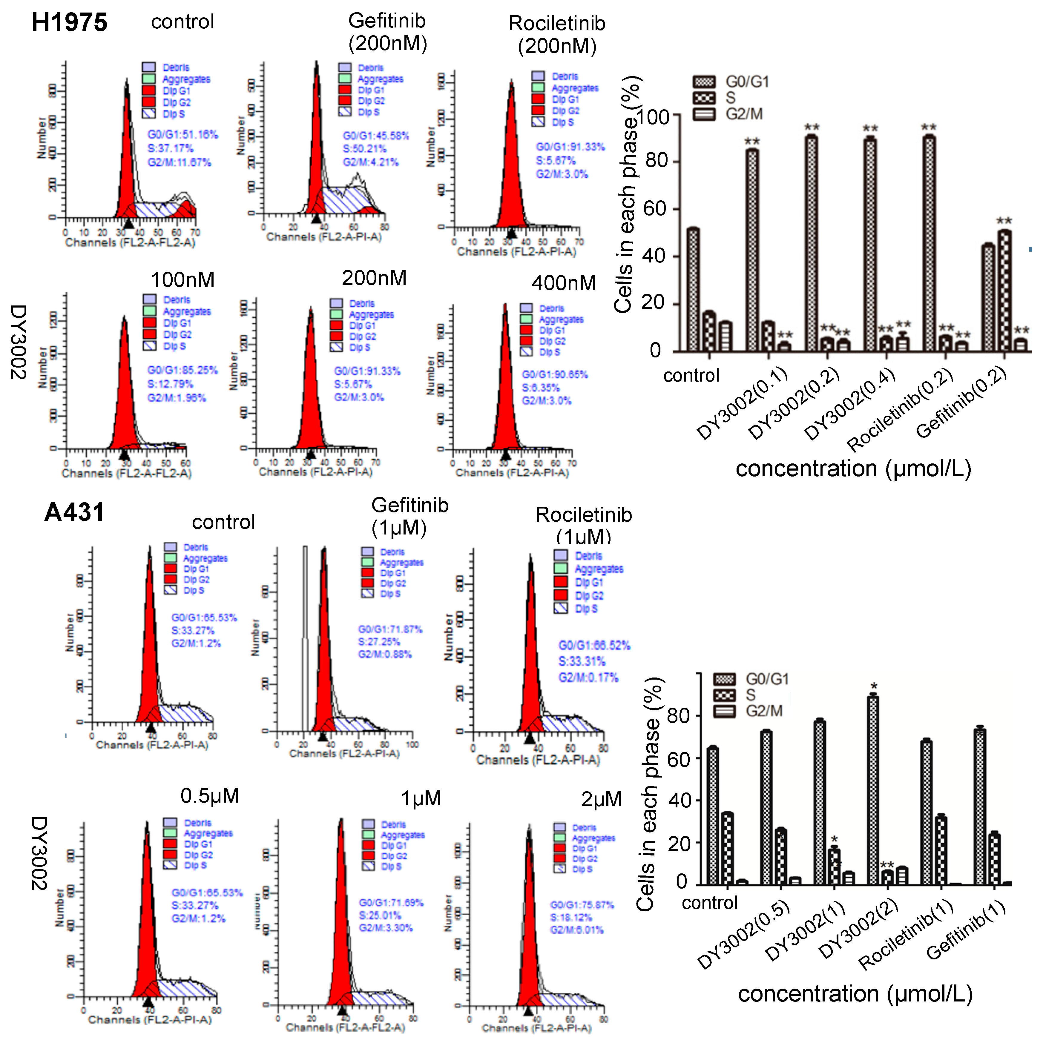 Effects of DY3002, rociletinib, and gefitinib on H1975 and A431 cells cycle arrest detected by flow cytometry assay. Cells were treated with different concentrations of inhibitors for 48 h, collected and fixed with 70% ethanol at 4 °C overnight. Then, the cells were stained by the mixture containing 5 mL propidium iodide for 10 min at 37 °C, and the cell cycle was analyzed by a flow cytometer. * p < 0.05; ** p < 0.01.