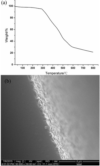(a) TGA of pentyl cage; (b) SEM image of the thickness of stationary phase coating in part of the pentyl cage-coated capillary column.