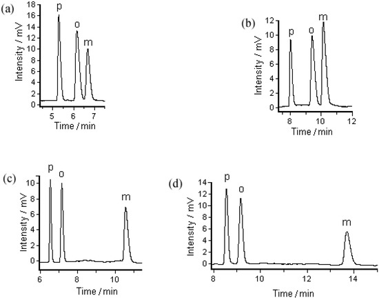 GC chromatograms using the pentyl cage-coated capillary column for separation of positional isomers: (a) o-, m-, and p-dibromobenzene under a N2 flow rate of 13.8 cm∙s−1 at 90 °C; (b) o-, m-, and p-dibromobenzene under a N2 flow rate of 13.8 cm∙s−1 at 110 °C; (c) o-, m-, and p-nitrochlorobenzene under a N2 flow rate of 14.9 cm∙s−1 at 115 °C; (d) o-, m-, and p-nitrobromobenzene under a N2 flow rate of 14.9 cm∙s−1 at 120 °C.