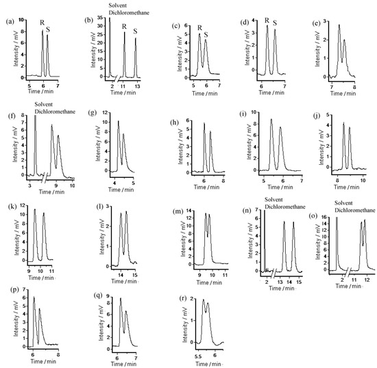 GC chromatograms on the pentyl cage-coated capillary column for separation of racemates: (a) styrene oxide; (b) trans-stilbene oxide; (c) 1,2-epoxybutane; (d) 1,2-epoxyhexane; (e) 1-bromo-2,3-epoxypropane; (f) n-butyl glycidyl ether; (g) 1-methoxy-2-hydroxypropane; (h) 1-methoxy-2-butanol; (i) 3-butyn-2-ol; (j) 1-phenylethanol; (k) 1-phenyl-1-propanol; (l) 4-chlorophenethylalcohol; (m) 2-phenyl-1-propanol; (n) 1-naphthylethanol; (o) 1-(2-naphthyl)ethanol; (p) methyl 3-hydroxybutyrate, (q) ethyl 3-hydroxybutyrate; (r) γ-valerolactone. The separation conditions are shown in Table 3.