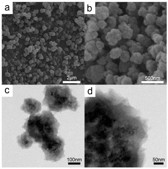 Representative SEM images (a,b) and TEM images (c,d) of Fe3O4@HKUST-1 core-shell structure.
