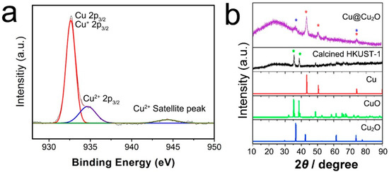 The XPS (X-ray photoelectron spectroscopy) spectrum of Cu@Cu2O is shown in Figure 3a. As expected, Cu@Cu2O nanostructures showed peaks at 932.8 (Cu 2p3/2). Because of the small difference between binding energies of Cu and Cu2O (0.1–0.2 eV), determination of Cu and Cu2O is difficult by XPS analysis. A small amount of CuO in the nanostructure was confirmed by a small Cu2+ 2p3/2 peak (934.0 eV) and Cu2+ satellite peak. The powder X-ray diffraction (XRD) patterns of the two types of prepared HKUST-1 structures are shown in Figure 3b. According to the XRD patterns, the Cu@Cu2O sample presents an XRD pattern consistent with the data reported for Cu (JCPDS No. 04-0836) and Cu2O (JCPDS No. 77-0199) (Figure 3a), while the calcined HKUST-1 sample (Figure 3b) presents an XRD pattern consistent with the data reported for CuO (JCPDS No. 80-1917). We thus confirmed that the calcined HKUST-1 sample contains Cu2+.