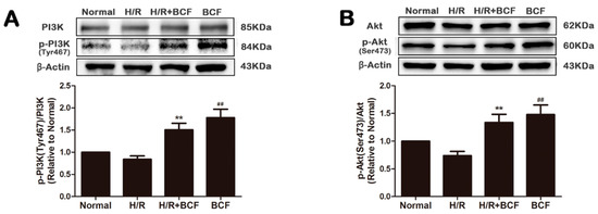 To explore whether the cardioprotection of BCF connected with the modulation of PI3K/Akt pathway, some crucial proteins, such as PI3K and Akt were tested by western blotting. As shown in Figure 2, compared with the H/R group, the expression of p-PI3K (Tyr467) and p-Akt (Ser473) was significantly increased by BCF pretreatment (p < 0.01). The results suggested that BCF might activate PI3K/Akt pathway by increasing the phosphorylation of PI3K and Akt.