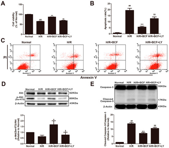 Blocking the PI3K/Akt pathway attenuated BCF-induced cardioprotection. H9c2 cells were pre-incubated with 20 μM LY294002 for 1 h, and then pretreated with BCF (3.125 μg/mL) for 4 h followed by H/R. (A) Cell viability was determined by CCK-8 assay; (B) The apoptotic ratio of H9c2 cardiomyocytes was measured by flow cytometry using Annexin V-FITC and PI staining; (C) The apoptosis rate was quantified by BD FACS software. Effects of BCF and the PI3K inhibitor (LY294002) on p-Akt (Ser473) (D); cleaved caspase-3 (E) and caspase-3 (E) expression levels in H/R-treated cardiomyocytes. β-Actin expression was examined as the protein loading control. Values were represented as mean ± SD (n = 6, each group). ## p < 0.01 vs. normal; * p < 0.05, ** p < 0.01 vs. H/R-treated cells; $ p <0.05, $$ p < 0.01 vs. H/R + BCF-treated cells.