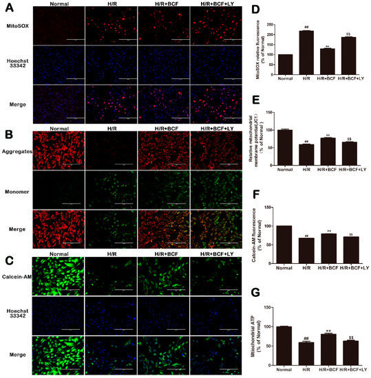 Effects of BCF on ROS-generating mitochondria, ∆Ψm, mitochondrial ATP production, and MPTP opening levels. (A) Mitochondria-associated ROS levels were detected by staining cells with MitoSOX (red). Nuclei were stained with blue-fluorescent Hoechst 33342; (B) Depolarization of ΔΨm was measured by Fluorescence Microscope using JC-1 probe; (C) Changes of MPTP opening in H9c2 cardiomyocytes were detected by calcein-AM (green) as a fluorescence indicator by fluorescence micrographs. Nuclei were stained with blue-fluorescent Hoechst 33342. The scaleplate represents 200 μm. All quantitative analysis of the florescence intensity was detected by a microplate reader. The corresponding histograms (D,E,F) were displayed. (G) Mitochondrial ATP production in H9c2 cardiomyocytes was determined using the ATP assay kit. Values were represented as mean ± SD (n = 6, each group). ## p < 0.01 vs. normal; ** p < 0.01 vs. H/R-treated cells; $$ p < 0.01 vs. H/R + BCF-treated cells.