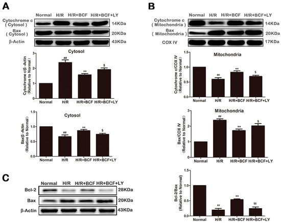 To further explore the molecular mechanism of BCF inhibited H/R-induced mitochondrial dysfunction, the translocation of Bax, the release of cytochrome c, and the expression of Bcl-2 were measured by western blotting. As shown in Figure 5, compared with the normal group, Bax was increased in the mitochondria (p < 0.01, Figure 5B) and decreased in the cytosol (p < 0.01, Figure 5A) in the H/R group. On the other hand, cytochrome c was released into the cytosol as a result of Bax translocation (p < 0.01). However, the translocation of Bax and the release of cytochrome c were both reduced in the H/R + BCF group, accompanied by the increase of the Bcl-2/Bax expression ratio (p < 0.01 or p < 0.05 vs. H/R group, Figure 5). When co-administering with LY294002, the above effects of BCF were partially attenuated (p < 0.05 or p < 0.01).